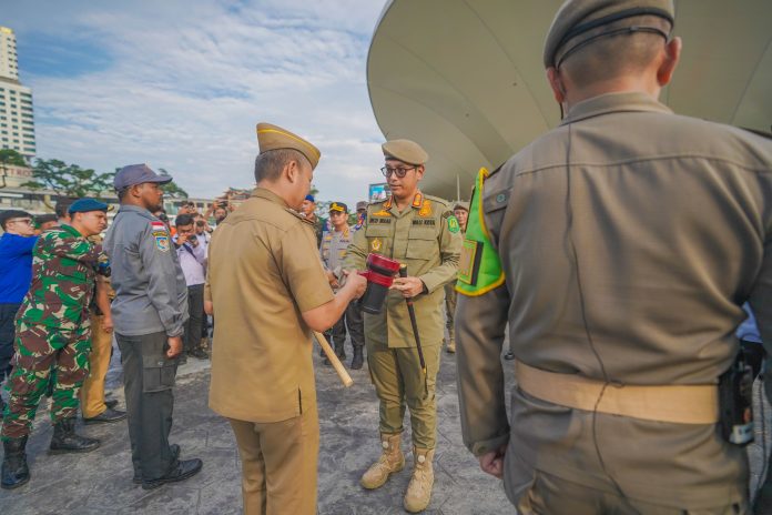 Dihadapan para pimpinan perangkat daerah, Kasatpol PP Kota Medan Rahmat Adisyah Putra Harahap, Camat se-Kota Medan, serta seluruh peserta apel, Rico Waas juga turut menyematkan lencana kepada personil Batalyon Jalak Cakti dan perlengkapan siskamling berupa pentungan dan lampu senter.(Alian/rel)