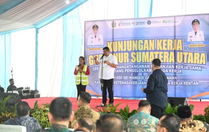 Hal tersebut disampaikan Bobby Nasution saat Kunjungan Kerja sekaligus Penandatanganan Perjanjian Kerja Sama Tentang Pengelolaan Tenaga Kerja di KEK Sei Mangkei, dan Penyerahan Kartu BPJS Ketenagakerjaan bagi Tenaga Kerja Rentan, di KEK Sei Mangkei, Kabupaten Simalungun, Kamis (09/10/2025).