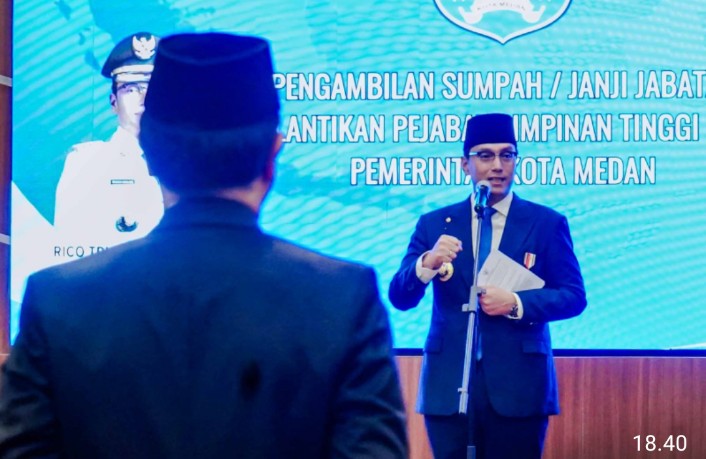 Wali Kota Medan Rico Tri Putra Bayu Waas melantik dan mengambil sumpah/janji jabatan empat Pejabat Tinggi Pratama di lingkungan Pemerintah Kota (Pemko) Medan, Jumat (13/3/2026) di Ruang Rapat III Kantor Wali Kota. Dalam arahannya, Rico Waas menekankan agar jabatan yang diemban dijalani dengan ikhlas karena tantangan ke depan akan semakin berat.