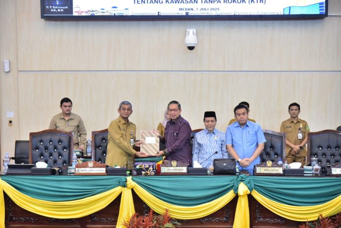 Pemko Medan dan DPRD Kota Medan melanjutkan pembahasan Ranperda Tentang Perubahan Atas Perda Kota Medan No 3 Tahun 2014 Tentang Kawasan Tanpa Rokok (KTR) melalui rapat paripurna DPRD Kota Medan dengan agenda Pemandangan Umum Fraksi-Fraksi DPRD Kota Medan, Senin (07/07/2025).