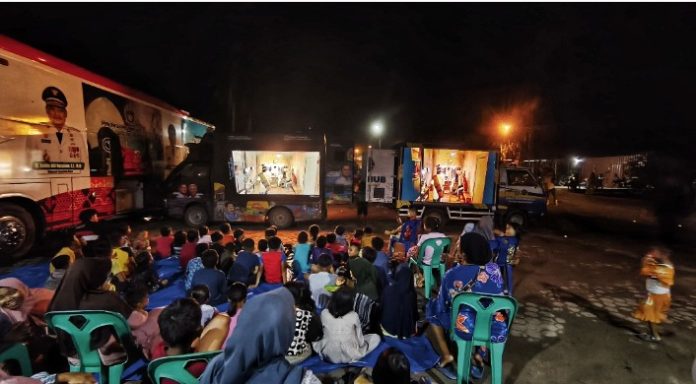 Para relawan bersama warga korban banjir dan longsor dari Desa Garoga, Hutagodang dan Ngandol, beramai ramai menonton film “Agak Laen” yang di tayangkan oleh mobil videotron milik Dinas Kominfo dan Dinas Perhubungan Sumut, di posko pengungsian, Desa Batuhula, Kecamatan Aek Garoga, Tapanuli Selatan, Sabtu (27/12/2025). (Alian/rel)