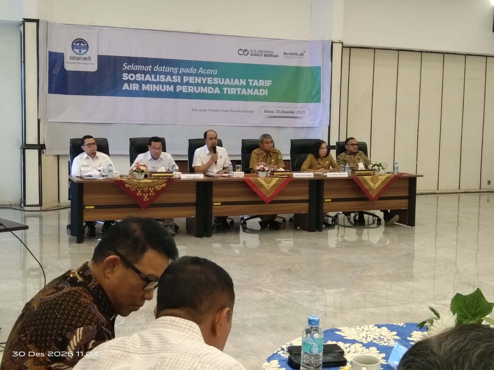 Perusahaan Umum Daerah (Perumda) Tirtanadi Provinsi Sumatera Utara melakukan sosialisasi penyesuaian tarif air kepada masyarakat di Kantor Pusat Perumda Tirtanadi, Jalan Sisingamangaraja No 1 Medan, Selasa (30/12/2025). Kegiatan ini dihadiri Kabiro Perekonomian Setdaprovsu, jajaran Direksi Perumda Tirtanadi, Dewan Pengawas, Sekretaris Komisi C DPRD Sumut, Sekda Kota Medan, camat dan lurah se-Kota Medan, elemen mahasiswa, LSM, dan perwakilan tokoh masyarakat dari 21 kecamatan se-Kota Medan.