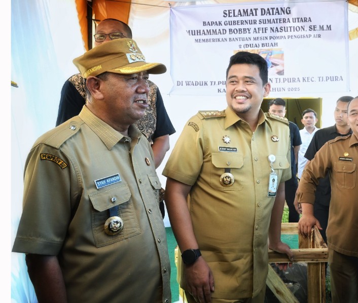 Gubernur Sumatera Utara (Sumut) Bobby Nasution meninjau pengerukan sedimen waduk di Kelurahan Pekan, Kecamatan Tanjungpura, Langkat, Senin (21/07/2025). Pada peninjauannya tersebut, Ia juga menyerahkan bantuan dua buah mesin pompa penghisap air.