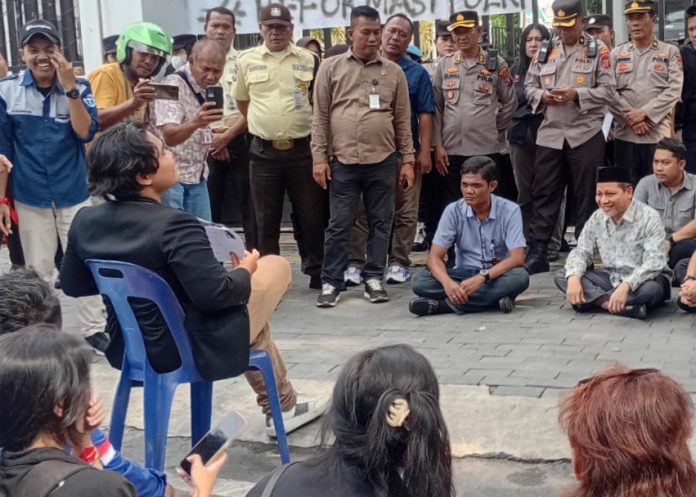 Aksi unjuk rasa Gerakan Mahasiswa Kristen Indonesia (GMKI) Cabang Medan berlangsung di depan kantor DPRD Kota Medan, Selasa (02/09/2025). Aksi tersebut disambut langsung oleh Wakil Ketua DPRD Medan, H. Rajuddin Sagala, didampingi staf DPRD, Martin Gurning.