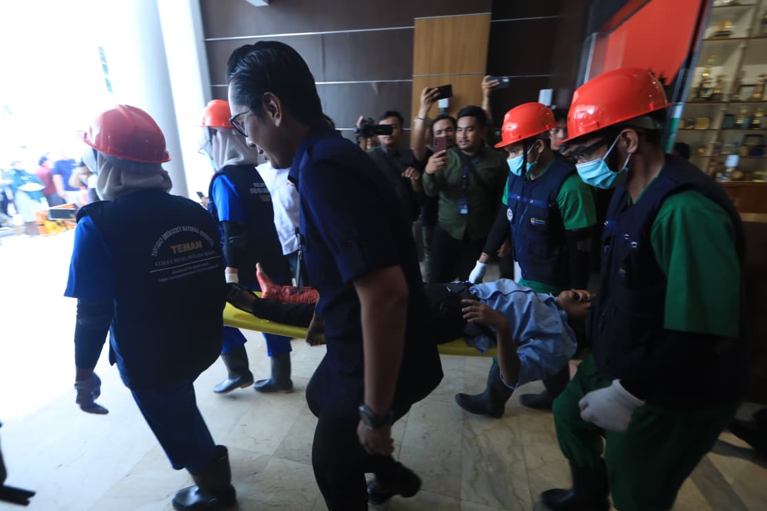 Satu menit berjalan, saat situasi sudah dinyatakan aman dan suara sirine berakhir, petugas keamanan mengarahkan Wali Kota Medan Rico Waas beserta kepala Dinas dan Camat untuk bergegas turun menggunakan tangga dengan posisi tangan tetap diatas bagian kepala serta leher kemudian berkumpul di titik kumpul.