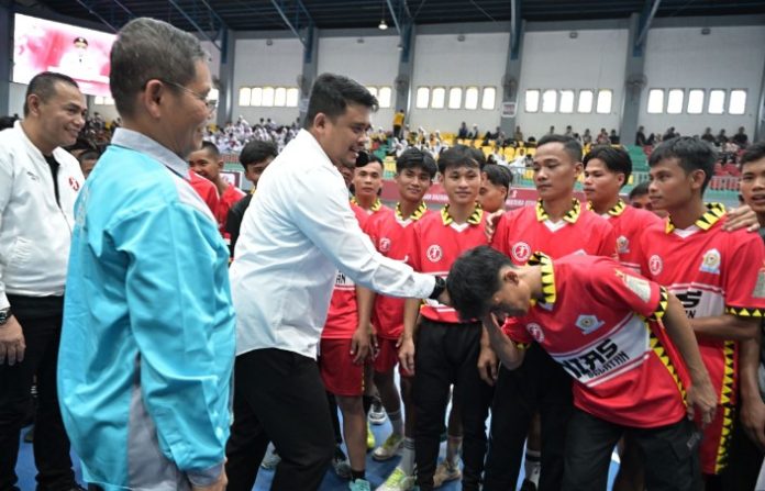 Gubernur Sumatera Utara (Sumut) Bobby Afif Nasution, bersama Ketua KONI Sumut, Hatunggul Siregar beserta OPD, membuka Kejuaran Daerah Bola Tangan Sumut tahun 2025 di GOR Futsal Dispora Provsu, Selasa (23/9/2025). (Foto : Ist)