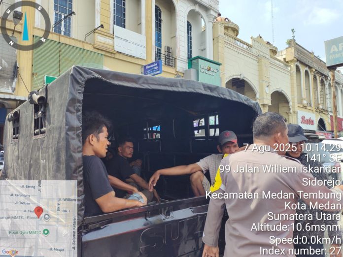 Pihak Kecamatan Medan Tembung bersama Kelurahan Sidorejo, Polsek Medan Tembung, dan Babinsa melakukan penertiban terhadap ‘pak ogah’ atau pengatur lalu lintas ilegal di depan Komplek MMTC, Jalan Willem Iskandar, Kamis (7/8/2025). Sebanyak enam orang yang terjaring dalam operasi ini dibawa ke Polsek Medan Tembung untuk mendapatkan pembinaan.